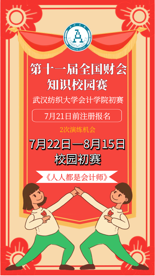 第十一届全国财会知识校园赛已经启动,为丰富公司同学们的暑期生活,提高老员工们开展实践和学科竞赛积极性,学院要求2018、2019级会计学和财务管理学专业的同学即日起至8月15日前按赛事完成100%注册竞赛报名,其他年级同学也希望积极报名参加,请同学们按照发放的流程(见附件),积极备赛。在8月15日前进行校园赛的演练(每位同学有2次演练机会),熟悉大赛流程和比赛内容。提示,原始账号:hb+手机号,密码:123456,账号密码无法登录的话,可以使用手机号加验证码的方式登录。