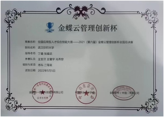 由中国商业会计学会主办、教育部高校毕业生就业协会校企合作委员会、万企千校平台为指导单位,金蝶精一信息科技服务有限公司承办的第六届金蝶云管理创新杯大赛中,公司丁璐、张耀武老师在赛前精心备战,严格执行备战计划,所指导的员工团队在参赛的1600余院校队伍中跻身决赛,并在进入决赛的98支队伍中突出重围,最终取得了本科组全国二等奖的优异成绩。公司党委书记杜国良和经理赵立彬为获奖员工颁奖并合影留念。