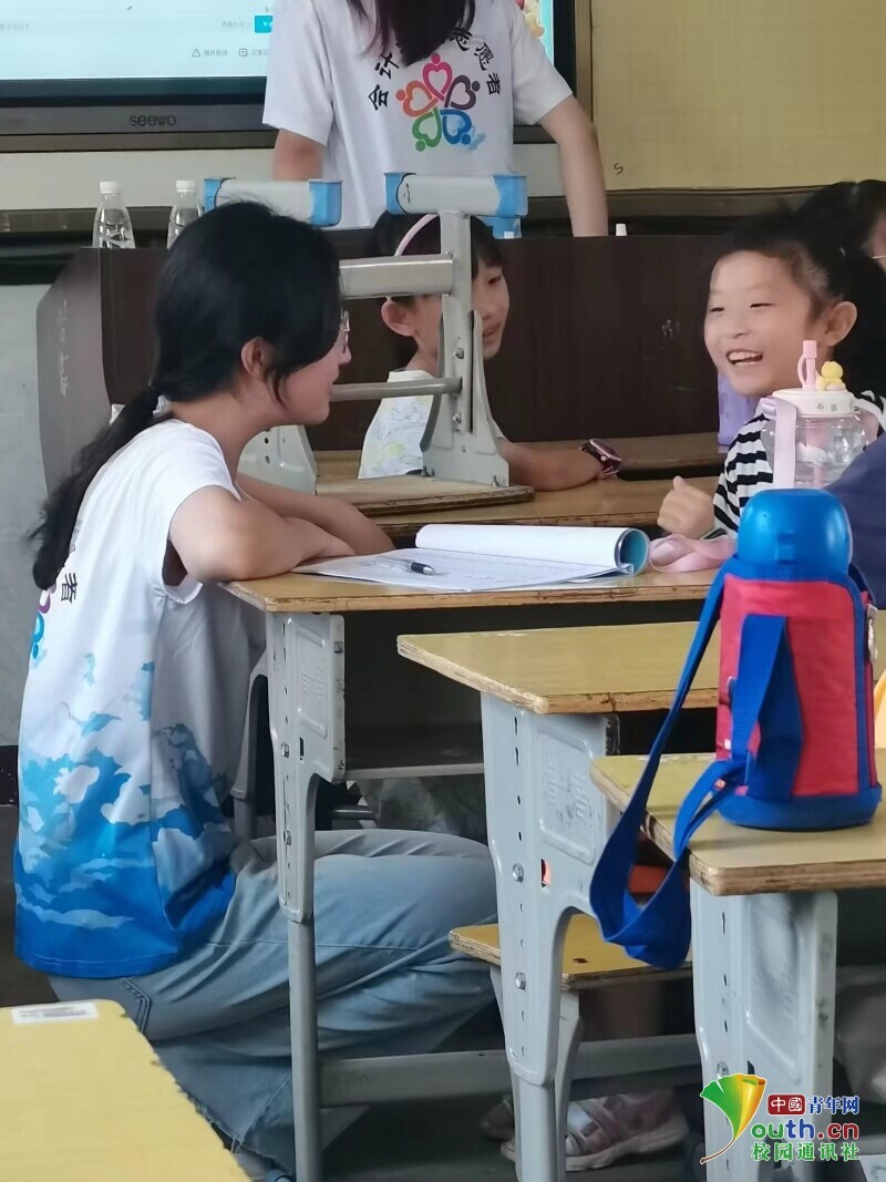 图为课后志愿者与同学交流课堂问题。中国青年网通讯员 马宇辰 供图