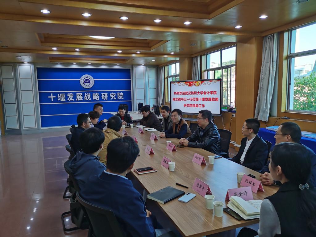 湖北汽车工业学院经济太阳集团tcy8722钱洁对杨志强一行的到来表示热烈欢迎,简要介绍了学院基本情况和十堰发展研究院情况。双方就专业建设、人才队伍建设、课题申报等方面进行了交流。