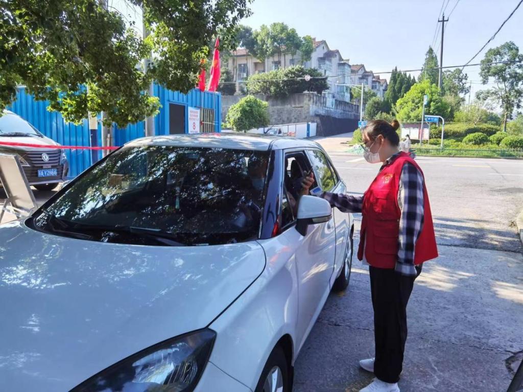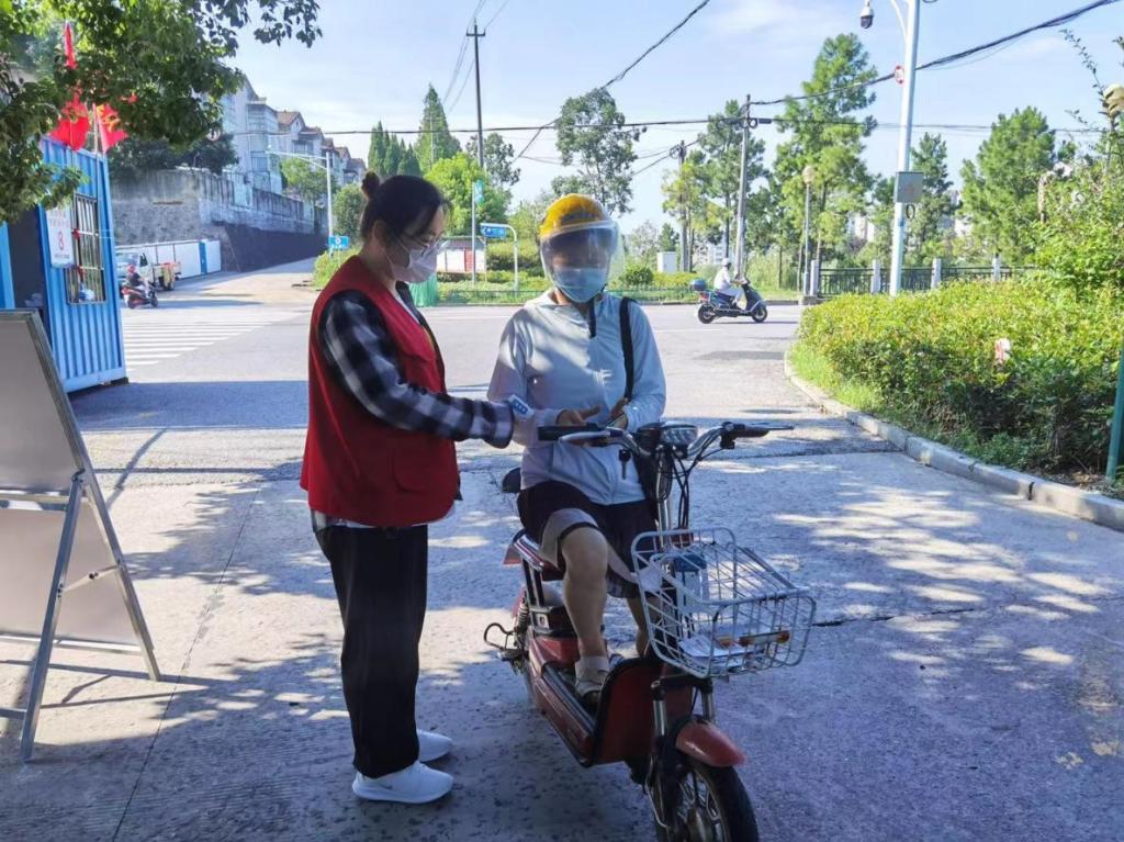 (图为蒋雨彤在社区执勤点处为出入的居民测温)