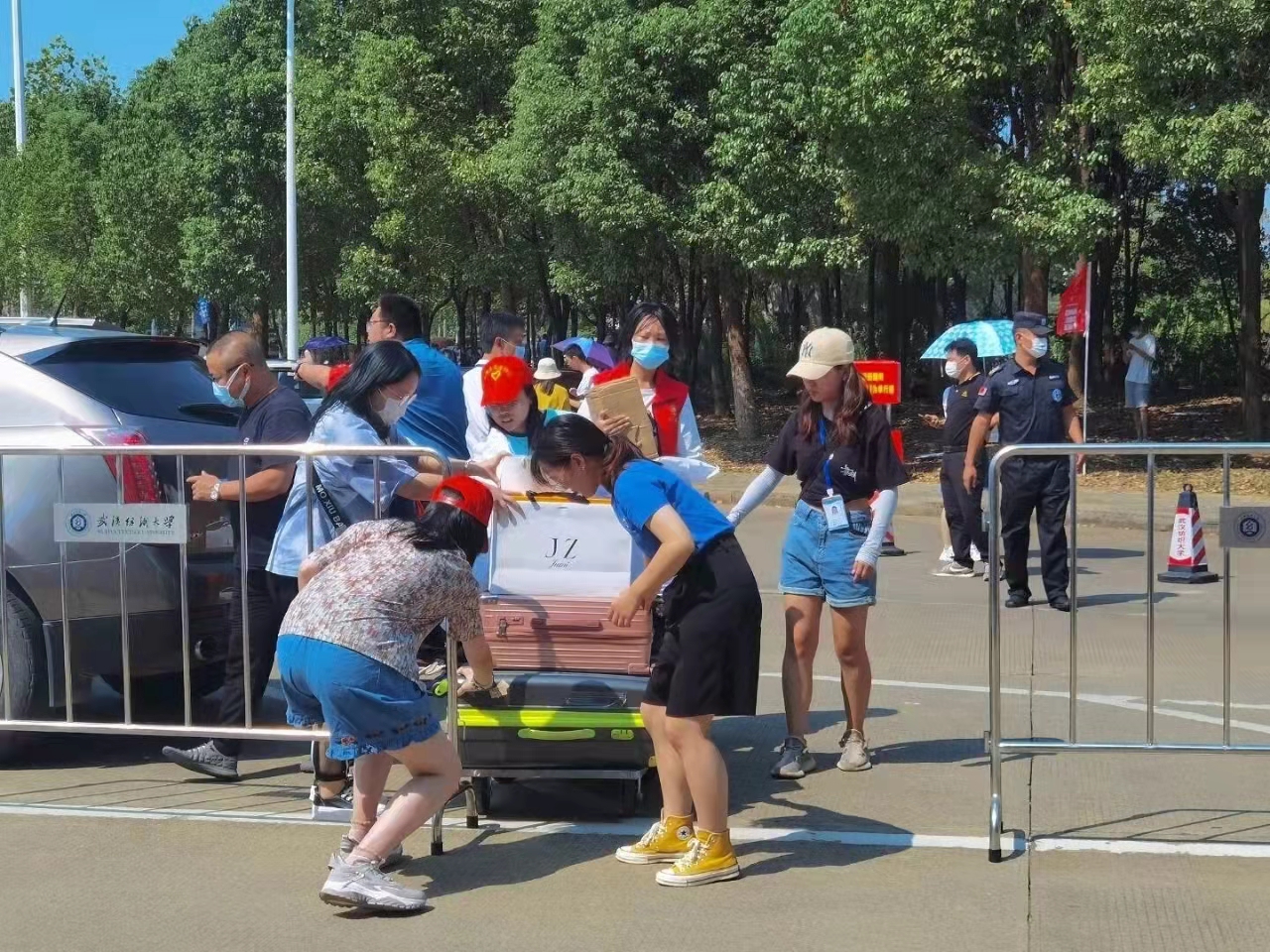 迎新当日,学院迎新工作人员和志愿者早上7点之前就到达指定接待点,等待新生的到来。因为新生家长不允许进入学校宿舍区,为了方便新生尽快完成报道手续,由迎新志愿者一对一服务,将他们的行李搬入宿舍并指引他们到指定地点完成报道,同时协助新生办理寝室入住手续。