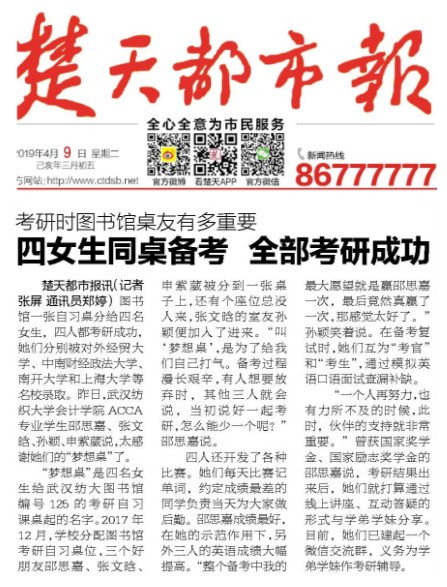 楚天都市报讯(记者张屏通讯员郑婷)图书馆一张自习桌分给四名女生,四人都考研成功,她们分别被对外经贸大学、中南财经政法大学、南开大学和上海大学等名校录取。昨日,太阳集团tcy8722ACCA专业员工邵思嘉、张文晗、孙颖、申紫葳说,太感谢她们的“梦想桌”了。“梦想桌”是四名女生给武汉纺大图书馆编号 125的考研自习课桌起的名字。2017年12月,学校分配图书馆考研自习桌位,三个好朋友邵思嘉、张文晗、申紫葳被分到一张桌子上,还有个座位总没人来,张文晗的室友孙颖便加入了进来。“叫‘梦想桌’,是为了给我们自己打气。备考过程漫长艰辛,有人想要放弃时,其他三人就会说,当初说好一起考研,怎么能少一个呢?”邵思嘉说。