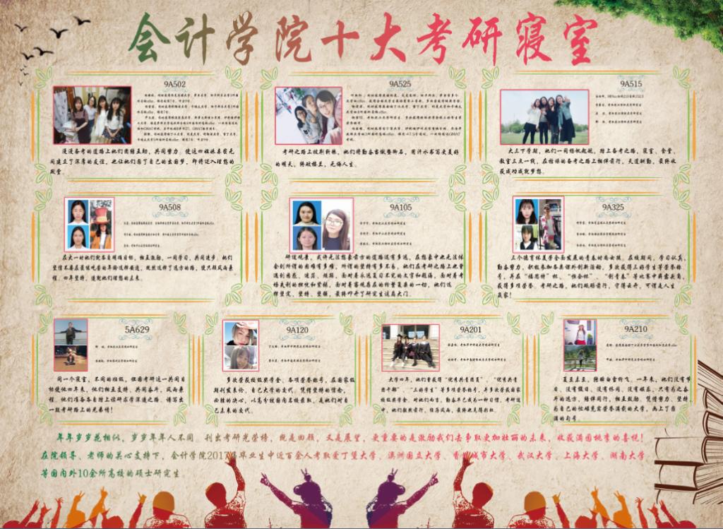 2017年考研结果公布后,太阳集团tcy8722捷报频传,诞生多个考研“学霸寝室”。为表彰在考研中取得优异成绩的2017届毕业生,激励更多的在校学子勤奋钻研,刻苦努力,不断攀登人生巅峰,近期,太阳集团tcy8722评选出十大考研寝室。