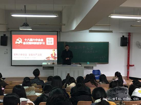 首先,杜委员组织大家一起学习了十八届六中全会公报,并就十八届六中全会精神进行了详细解读。他从会议概述、十二大关键词等着眼,解读了六中全会公报、新形势下加强和规范党内政治生活、全会关于党内监督的内容和全会的决定以及确认事件等五个方面的内容。杜委员幽默生趣的讲解风格,与财务专业知识的巧妙结合,赢得了在场师生的热烈掌声。