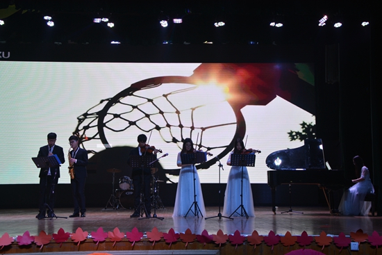 良辰美景今宵夜,赏心乐事驻心间。晚会在“洋葱头”乐队激情澎湃的演唱中拉开了序幕,电贝斯的低沉婉转,吉他的清透空灵,架子鼓的激昂节奏,让全场的气氛变得火热起来。帅气爵士舞,浪漫华尔兹,酷炫荧光舞……每支舞罢,现场热浪就一层高过一层。其中最让人过目难忘的当属古典形体舞《惊鸿一面》,表演者舞姿轻盈、飘逸、柔美,可谓“翩如兰苕翠,婉如游龙举”。更惊艳的莫过于简东萍、汪俊等四位老师带来的歌曲串烧,从黄梅戏到经典粤语《喜欢你》,从三尺讲台到舞台,他们的深情演唱也将整场晚会推向高潮!关于梦想与诱惑,一部音乐剧《诱惑森林》提醒同学们,不要为了利益与舒适丢失初心;关于亲情与友情,心理剧《薯愿》告诫同学们,与父母与朋友的感情都不是可以用金钱来衡量的。