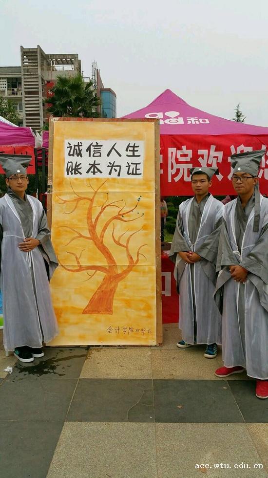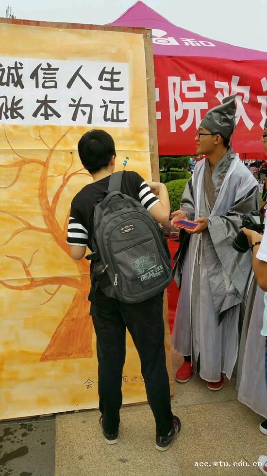 在现场可以看到,每一位前来报到的新生都能从“孔子”们那里领取一本精美的账本,在宣誓诚信后,孔子们将为他们在账本上盖上“诚信人生,账本为证”的印章,还会带领他们到事先准备好的画板前摁上手印。新奇有趣的方式赢得了众多新生的欢迎,大家都争着要上前来聆听“孔子”们的教诲,拿到盖了章的账本更是如获至宝。不一会儿,画板上就满满都是摁好的手印了。“真是太好玩了!”来自湖北黄石的赵同学由衷地笑道,“从小接受的诚信教育很多,不过像这样的还是头一回见,我已经拍照片发微博了!”