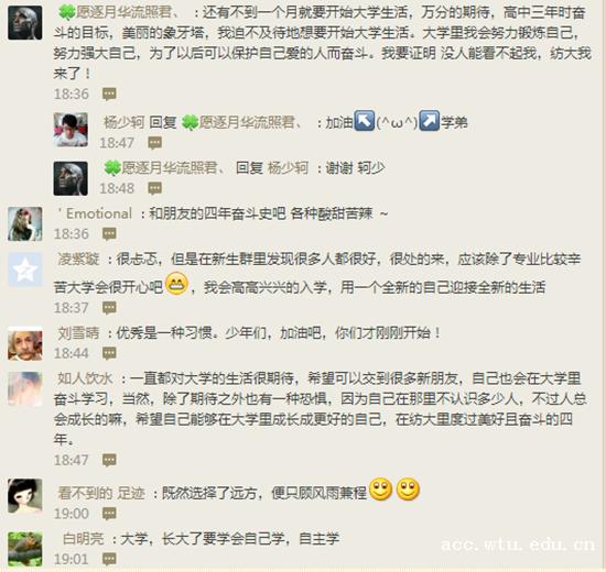 活动过程中同学踊跃发言参与讨论,纷纷表达了自己对老员工活的期许,对自己大学规划的想法。不少同学表示,在大学这个微型社会的四年中,自己将以学业为重,同时也将好好感受自己绚烂的青春。网名为‘半-透明少年’的同学谈到,大学会是一块基石,需要一路坎坷的走着;而网名为‘55郭寒55’同学说:想要有一天变成自己想要成为的人。