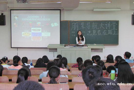 在讲座的开始,成广林便用带有趣味性的PPT吸引了同学们的注意,与同学们分享了自己大学两年来特别是作为志愿者的经验与经历,积极引领同学们规划自己的未来。她也鼓励同学们多做一些公益活动,向社会奉献自己的爱心。而针对15级新生刚踏入大学,对全新老员工活还不适应的情况,成广林建议在座的同学们要注意作息规律,不要枉费自己学习的时间;把学习与实践相并重,从实践中获得经验,把自己变得更强大。在讲座的最后,她劝诫同学:“树立正确的目标,战胜自卑,建立自信,利用课余时间,并且坚持不懈才能成就大学里面真正的自我”。