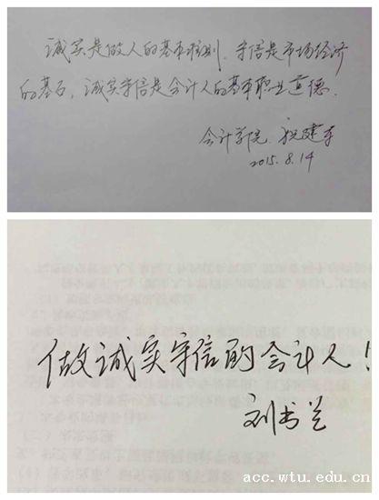 太阳集团tcy8722的领导老师们也积极导航,率先做出了表率,副经理祝建军教授谈到:诚实是做人的基本准则,守信是市场经济的基石,诚实守信是会计人的基本职业道德。而副经理刘书兰教授也在纸上郑重写下:做诚实守信的会计人!同时,新生们也积极参与,财务管理专业11501班的向苗同学宣誓道:我们必须争做人民钱财的护航者,诚信会计,不做假账。
