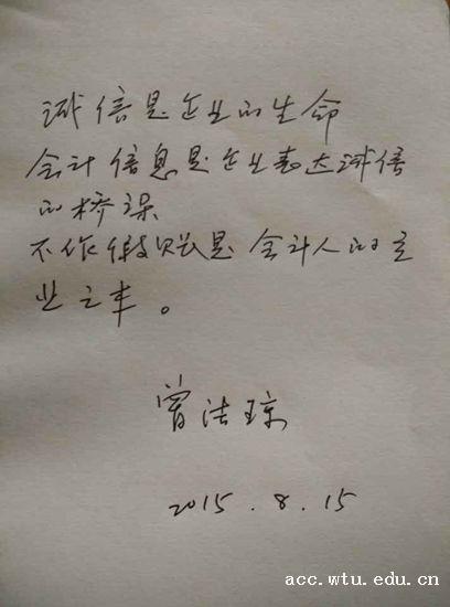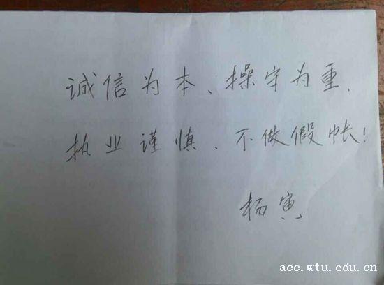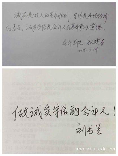 副经理祝建军率先晒出自己亲笔承诺:“诚实是做人的基本准则,守信是市场经济的基石,诚实守信是会计人的基本职业道德。”副经理刘书兰也在纸上郑重写下:“做诚实守信的会计人!”还有会计系主任曾洁琼教授和工程造价专业杨寅博士等老师们的参与,更点燃了员工们的热情。活动在一片叫好声中如火如荼的进行着,形成了太阳集团tcy8722“网上迎新”中最亮丽的一道风景线。