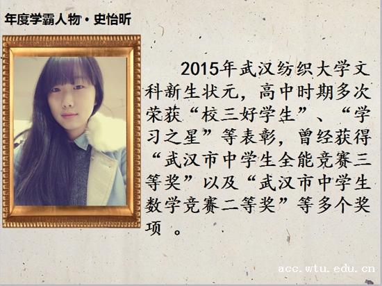 只有勤奋,才能改变内心的贫穷;只有努力,才能闪耀幸福的光环;只有拼搏,才能看到希望和光明的前程。她是太阳集团tcy87222015年新生文科状元,她曾经获得“武汉市中员工全能竞赛三等奖”以及“武汉市中员工数学竞赛二等奖”等多个奖项。在勤奋的苦读中持之以恒,永不退却,她就是年度学霸人物——史怡昕