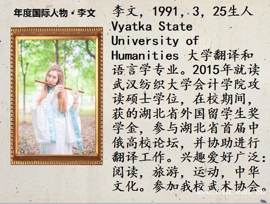 千里之行,只为能畅游一番学海,书本上的精神食粮给她们坚持下去的理由;背井离乡,再多的辛酸她们也不曾放弃,故乡的晚星,无数次在她们的梦里闪烁。既然选择了远方,她们便勇往直前。入乡随俗,她们吸收了博大的中华文化;奔赴异地,她们也为我们带来了更多异国风情。她们就是年度国际人物——来自俄罗斯的职工李文。