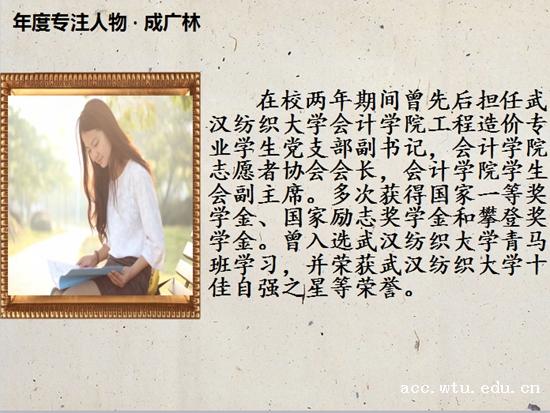在校两年期间曾先后担任太阳集团tcy8722工程造价专业员工党支部副书记,太阳集团tcy8722志愿者协会会长,太阳集团tcy8722员工会副主席。多次获得国家一等奖学金、国家励志奖学金和攀登奖学金。曾入选太阳集团tcy8722青马班学习,并荣获太阳集团tcy8722十佳自强之星等荣誉。助人为乐,她用奉献与爱心铸成一道彩虹。关爱孤寡老人,她给老人送去温暖;山区支教,她给深山学子带去知识和关怀。满怀热情,她在真诚的奉献中成就自我,她就是年度专注人物—广成林