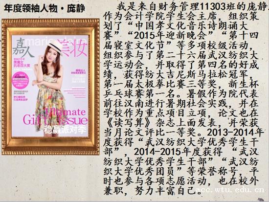 能力卓越,工作负责,她是领袖中的杰出人物。作为班长,她是班级力量凝聚的核心;作为员工会主席,她是太阳集团tcy8722员工的榜样。她用汗水浇灌学业,她将激情赋予工作。他用自己的智慧和行动带领太阳集团tcy8722员工会不断向前。她就是年度领袖人物——庞静