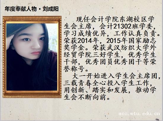 三载青春,他的付出从不计过回报;一腔热血,他的初衷一直是为更多同学服务。从干事到主席,从员工干部到办公室助理,每一个职位,他都致力于员工工作;国家励志奖学金、优秀团员、三好员工、优秀团干部,每一份奖励的肯定都给他更大的动力去做好自己的工作。他就是年度奉献人物——刘成阳。