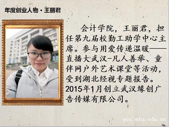 士不可以不弘毅,任重而道远。不弃,不馁是她对困难的回答。不畏,不卑是她创业的态度。她是第九届校勤工助学中心副主席,参与用爱传递温暖—直播大武汉—凡人善举。她凭借自己的努力,在2015年1月创立武汉缘创广告传媒有公司。她就是年度创业人物——王丽君