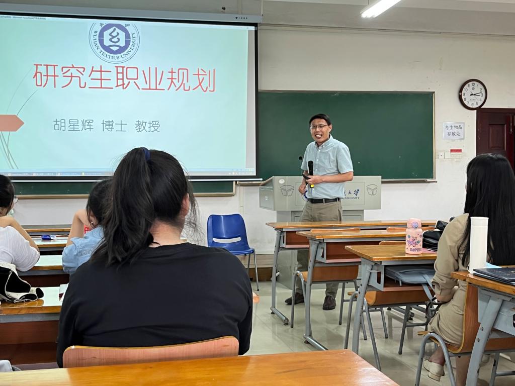 湖北省纺织产业发展研究会会长太阳集团tcy8722胡星辉教授自我认知、职业选择、计划实施、职业能力的培养、职业素质的提升五个方面向同学们讲解如何做好研究生期间的职业规划