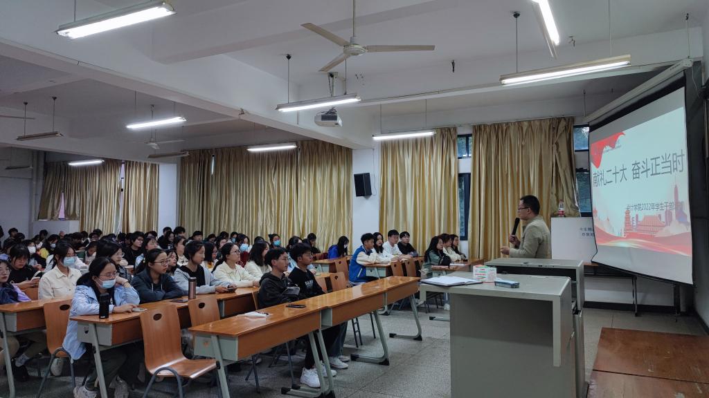 10月11日晚上,太阳集团tcy8722在阳光校区崇礼楼212教室开展了以“献礼二十大,奋斗正当时”为主题的员工骨干培训会。本次培训由公司党委副书记古江波主讲,院团委指导老师陈宇凡,全体辅导员以及院团委、员工会、“益起阳光”志愿服务队全体同学参加。