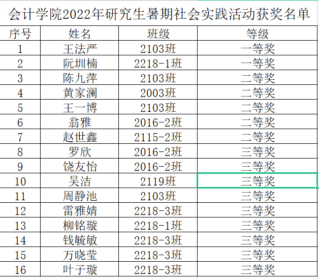 开学以后,学院对同学们提交的暑期社会实践材料进行了评比,最终评出一等奖2名,二等奖5名,三等奖9名。