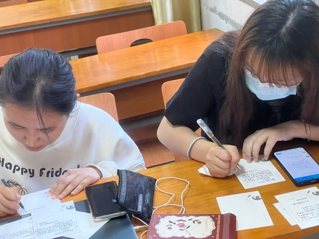 “一世艰辛,默默把知识奉献,您是文明的使者,是辛勤的园丁,衷心感谢您,祝您工作顺利!”“朝霞般美好的未来在向你们招手,祝同学们学业有成。”活动开始前,大家一笔一划,将对老师和同学们的祝福写在明信片上。