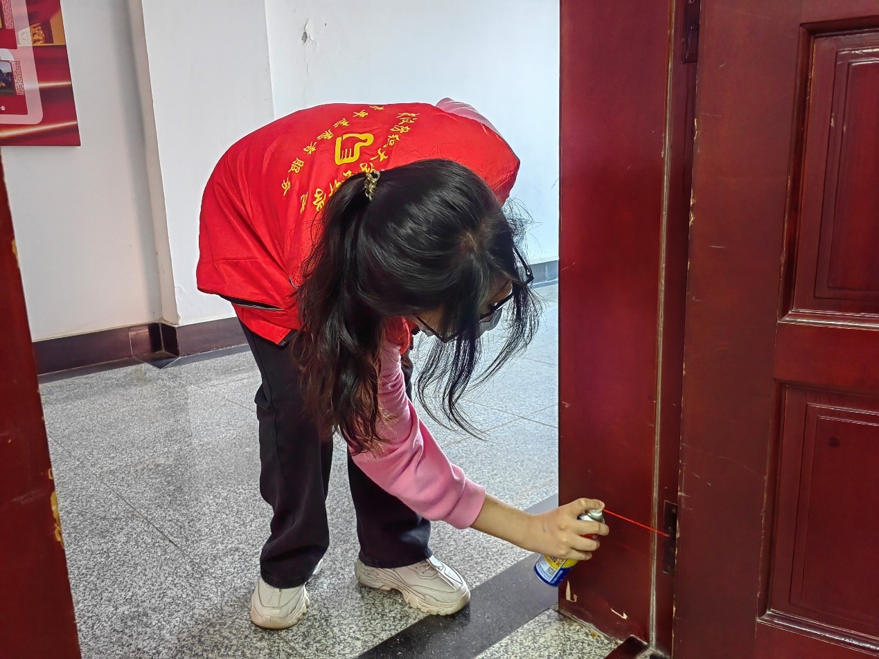 做好准备工作后,志愿者们分成8个小组,分工协作,为教室与办公室的桌椅、门轴等处涂上润滑油,为辛勤工作的老师们送上鲜花,为勤奋学习的同学们带来“阳光”。在教室里自习的同学们纷纷表示,门“嘎吱嘎吱”的声音没有了,随之而来的是一天的好心情。