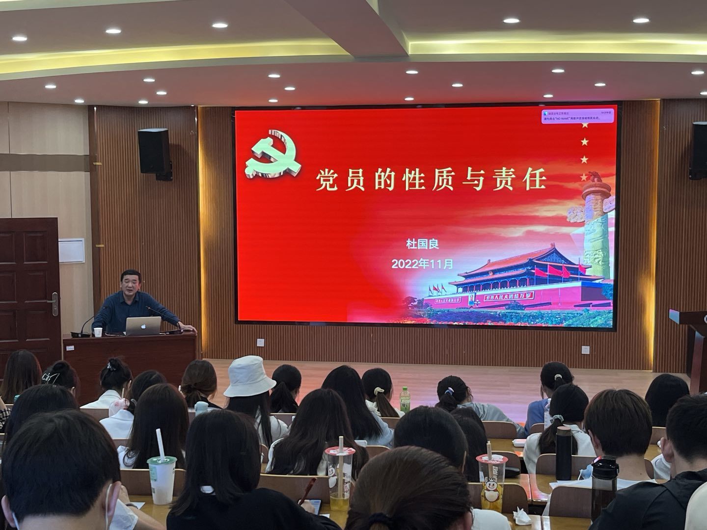 杜国良首先回顾了自己入党的宝贵经历,畅谈工作近30年来对党的光荣历史的深刻感悟。随后,他结合革命先驱艰辛探索和中国共产党诞生的伟大历程,展示了中国共产党的初心使命。接着他从党章的具体内容出发,向同学们解读了党员的基本性质义务以及党员的纪律要求。最后,杜书记介绍了党员的发展流程,阐述了入党的严肃性和程序性,寄语同学们严格要求自己,积极向党组织靠拢。