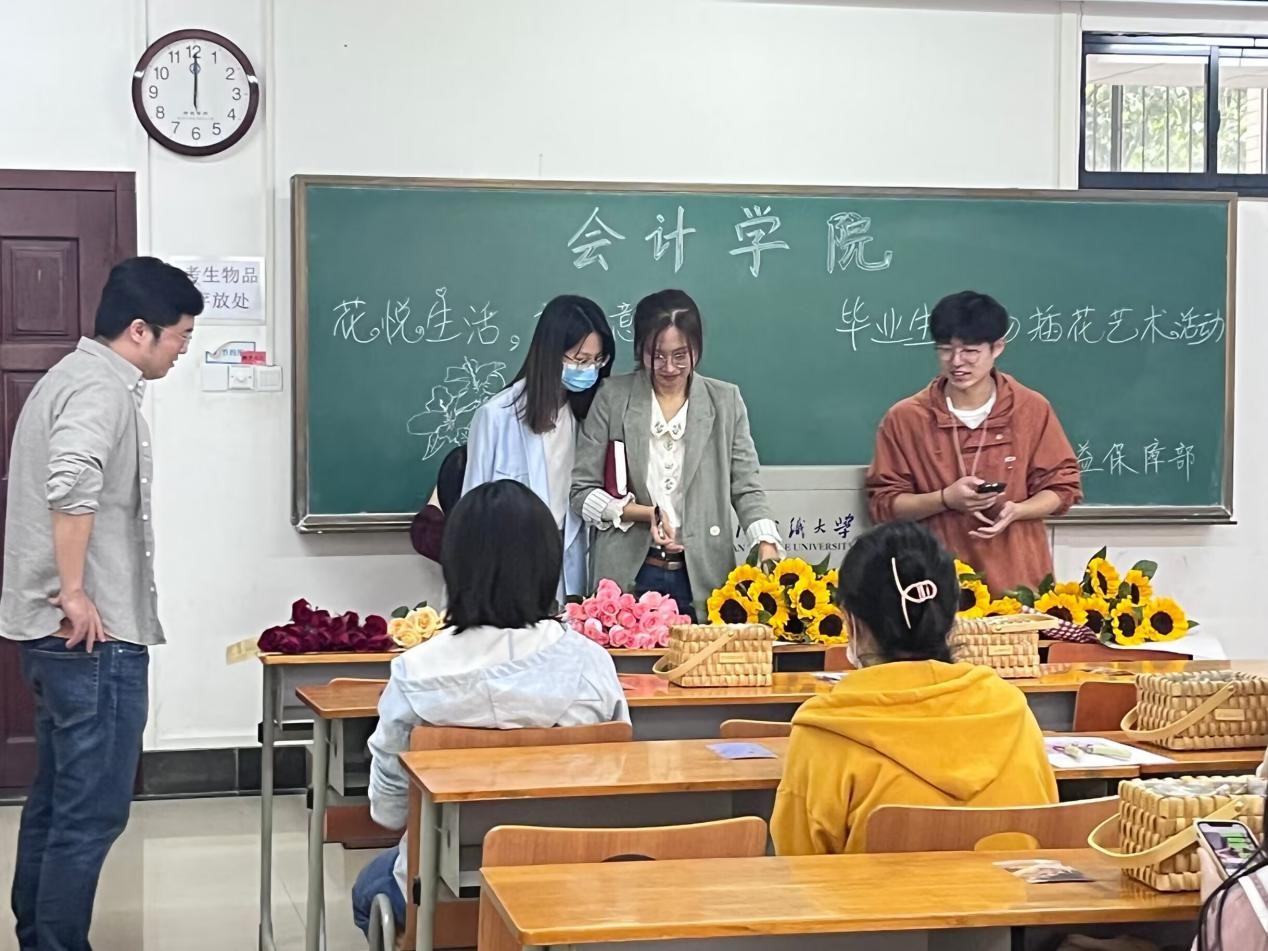 为了给毕业生搭建沟通交流的平台,帮助毕业生缓解压力、愉悦心情,11月11日上午,太阳集团tcy8722在阳光校区7栋教学楼122教室举办“花悦生活,指尖艺境”毕业生专场插花艺术活动。太阳集团tcy8722团委指导老师陈宇凡,2019级辅导员张秋实、查怡然以及三十余名毕业生参加了本次活动。