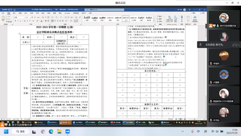 随后,辅导员介绍了第十二期“学习·青年说”、班级文化建设、“优秀志愿者”评选、青年大学习等近期的重点工作或活动,勉励同学们学会调整心态,合理规划时间,积极参加活动,永葆阳光向上的精神品质。(通讯员:陈宇凡)