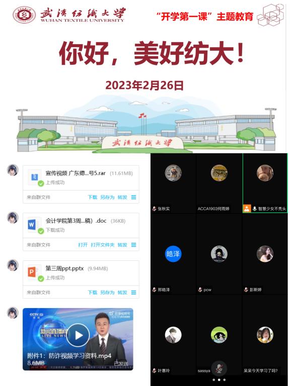 2023年2月26日,公司开展了“你好,美好纺大!”主题班会,就防范电信诈骗、高校宗教政策与管理规定、学雷锋相关内容进行了解读。各年级辅导员、各班班主任组织并参加班会。