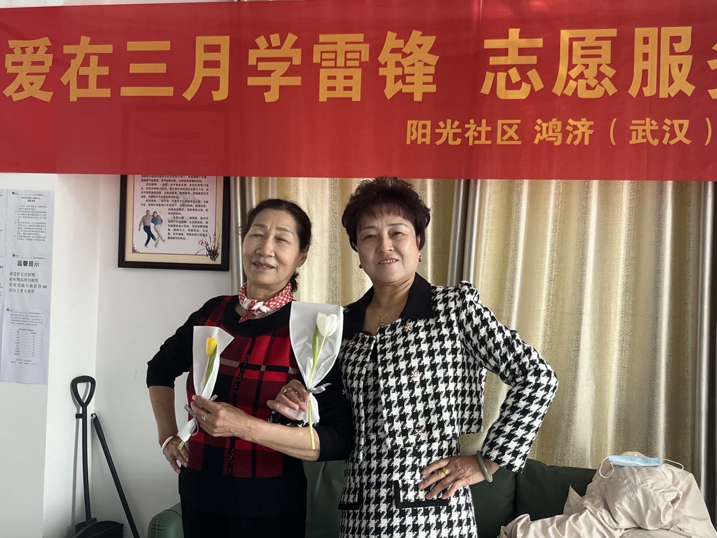 图为阳光社区居民收到鲜花露出笑颜。