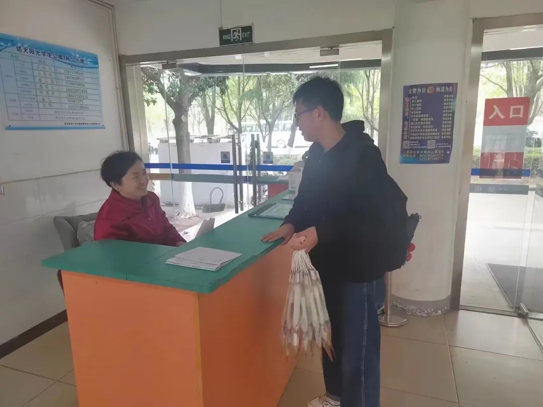 图为志愿者为宿管阿姨送花,感谢她们的辛勤付出。