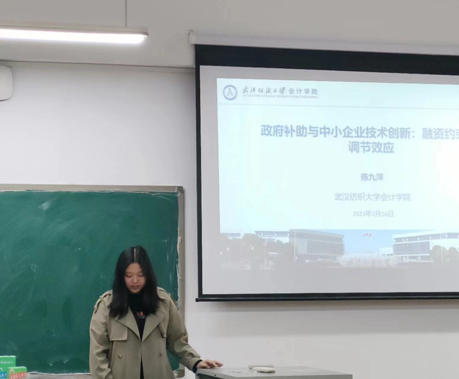 陈九萍同学分享了她的论文《政府补助与中小企业技术创新:融资约束的调节效应》,介绍了该论文的研究动机、研究问题、模型设计与数据选取、实证结果与分析以及总结与启示。漆老师提出了一些修改意见,建议研究中应突出中小企业的独特性、并以此为切入点展开研究。