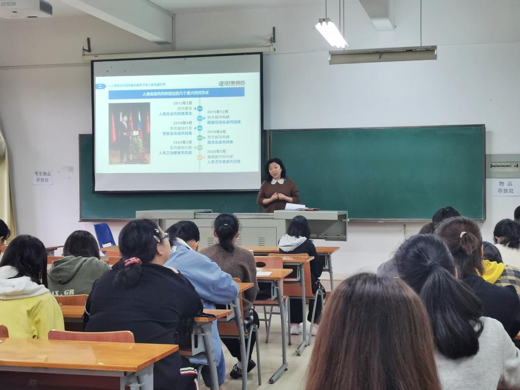 通过“伟大构想应时顺势”、“鲜明旗帜广泛认同”、“中国行动彰显担当”、“新时代青年担当”这四个层次阐述了这一年里在党的指挥下人民群众的抗疫历程。周晓燕通过举例,譬如国际友人对于中国物资帮助得感谢,中日疫情中的建交,中向英疫情治疗经验的分享等例子强调了命运共同体的理念,并提出了思考命运共同体于我们的意义,引发同学们的思考。周晓燕表示,疫情体现了中华民族的凝聚力以及临危不乱、舍身取义的民族精神,并教育同学们在中国梦即将实现的关键时刻,作为新时代新青年应明确自己的使命为国家奉献自己的力量。